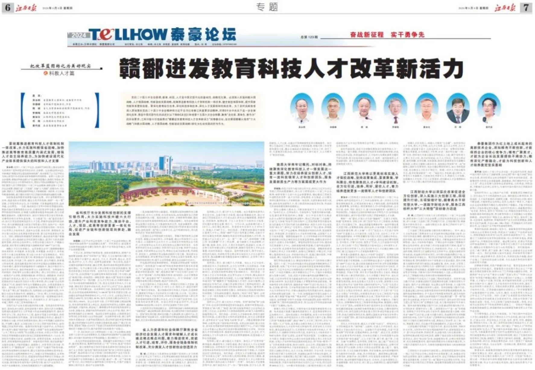 編者按:江西日報于8月7日連版刊登以“贛鄱迸發教育科技人才改革新活力”為主題的泰豪論壇。南昌大學黨委書記羅嗣海應邀參加論壇,暢談南昌大學改革發展舉措。他表示,南昌大學將牢記囑托、對標對表,持續聚焦深化教育科技人才一體發展這一重大課題,努力在培養拔尖創新人才、培育一流科技領軍人才和創新團隊、服務發展新質生產力等方面展現更大作為。