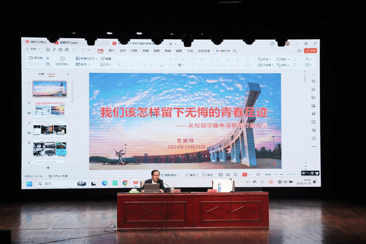 萬繼鋒以校園流行歌曲為切入點,圍繞新時代好青年的“四個標準”,對同學們提出了期望。希望同學們正確認識和把握學習與發展的關系,學會珍惜,砥礪前行;正確認識和把握自己與同學的關系,學會包容,豁達前行;正確認識和把握順境與逆境的關系,學會面對,勇毅前行;正確認識和把握東方與西方的關系,學會自信,感恩前行;正確認識和把握時代與責任的關系,學會擔當,逐夢前行;正確認識和把握自由與約束的關系,學會自律,循規前行。