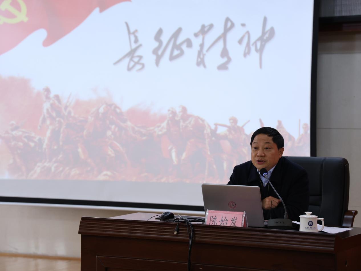 “今年是紅軍長征出發(fā)90周年,漫漫征途中,紅軍同敵人進(jìn)行了600余次戰(zhàn)役戰(zhàn)斗,跨越近百條江河,攀越40余座高峰,穿越茫茫草地,用頑強(qiáng)意志征服了人類生存極限。”陳始發(fā)以《長征精神》為主題,圍繞偉大長征孕育偉大長征精神、偉大長征精神的深刻內(nèi)涵及弘揚(yáng)偉大長征精神的時代要求三部分,從理想信念、奉獻(xiàn)犧牲、攻堅(jiān)克難、群眾路線等四個維度,以豐富的事例,深入淺出帶領(lǐng)師生一起回望長征艱苦卓絕的歲月,重溫波瀾壯闊的歷史,共同感受偉大的長征精神。