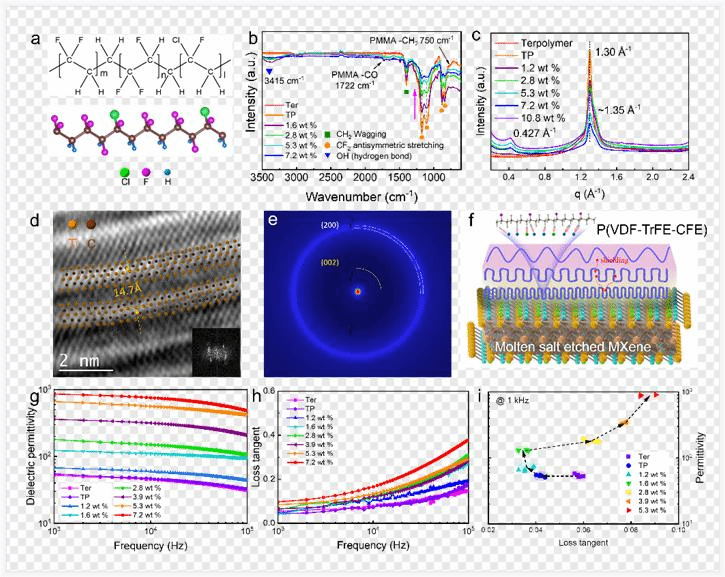 構建兼具低介電損耗和高介電常數的復合材料是制備高能量密度電容這一細分領域的關鍵課題。利用增強相和聚合物基體的界面相互作用提升兩相相容性,限制高分子鏈和副官能團在外電場中的運動,被認為是降低介電損耗和提升抗電強度的有效技術路徑。南昌大學研究團隊系統研究了聚合物基復合材料兩相界面相互作用機制(ACS nano 2018, 12, 3369; ACS Appl. Mater. Interfaces 2019, 11, 27358; Applied Physics Letters 2019, 114, 232903),首次采用Lewis酸刻蝕制備具有致密表面官能團的Ti3C2Tx MXene,利用-O, -Cl電負性表面官能團與高分子鏈C-H基團形成氫鍵,提升強化相與聚合物基體的界面相容性。該研究工作表明,利用強界面作用誘導高分子鏈在兩相界面處進行重排構成致密的鈍化層,能夠有效降低漏導電流和空間極化引起的介電損耗。